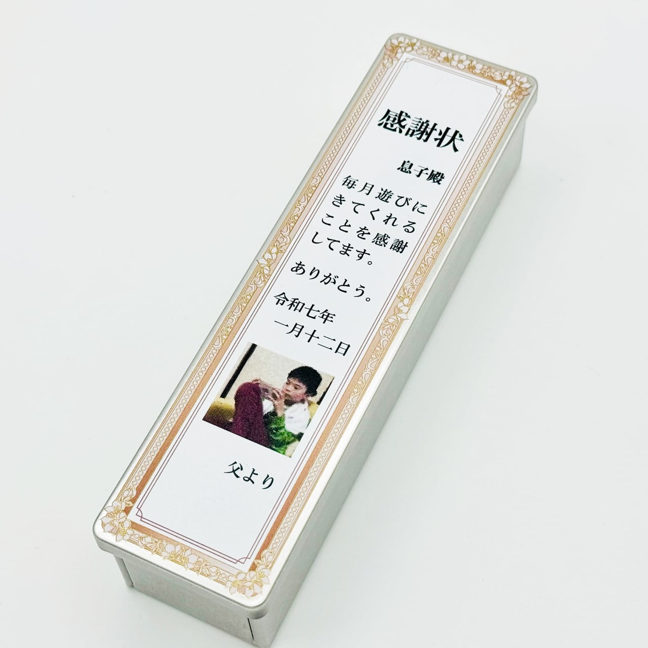 日頃の感謝を伝えたい相手に特別な缶はいかがでしょうか。 感謝状は額縁ライン部分がゴールドの上品なデザインです。 感謝状の文章、下部の画像はご自由に入れていただけます。